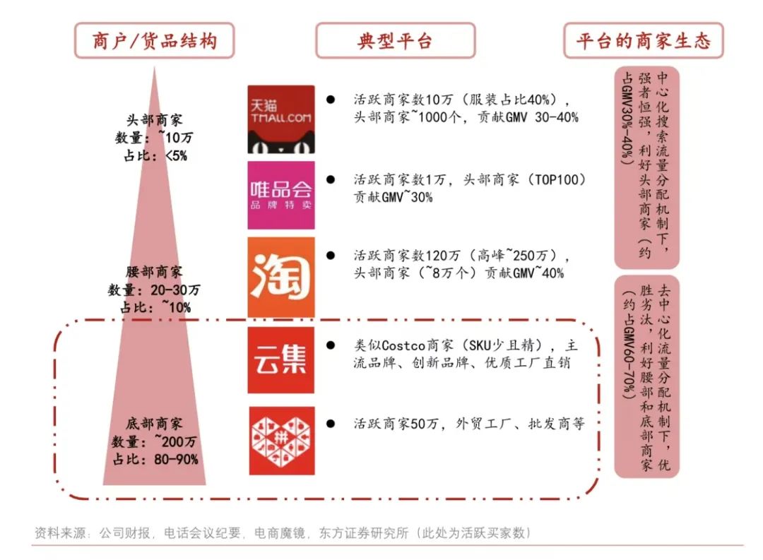 東方證券發(fā)布的報告指出,傳統(tǒng)電商平臺采取“中心化搜索流量分配”機(jī)制,強(qiáng)者恒強(qiáng),頭部商家GMV集中度高。天貓活躍商家數(shù)超過10萬家,約占商家總數(shù)1%的頭部商家,貢獻(xiàn)了GMV的30%-40%。而在擁有超過120萬活躍商家的淘寶,頭部商家(約6%)貢獻(xiàn)了40%的GMV。