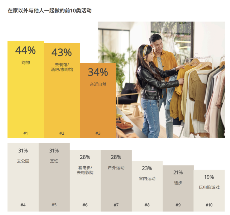 在家以外,人們與他人一起做的最多的三項(xiàng)活動是購物、去餐館/酒吧/咖啡館和親近大自然。但是,不同市場之間存在很大差異,例如,在所有國家/地區(qū)中,中國最活躍,而瑞典最不活躍。報告發(fā)現(xiàn),人們參與家以外的活動,主要是因?yàn)闃吩谄渲?(80%)。然而,獲得娛樂 (76%)、支持身心健康 (74%) 以及擺脫繁瑣的日常生活 (73%) 也是較多人趨向家以外活動的原因。