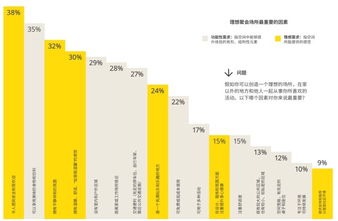 報告指出,為了應(yīng)對變化,聚會場所必須不斷適應(yīng)、演變和發(fā)展,以滿足人們的需求和愿望——無論是情感或功能需求,還是線上或線下的生活需求。對中國受訪者而言,參與社交活動的首要考慮除了追求樂趣外,認(rèn)同感相關(guān)的動機(jī)——與志趣相投的人相處、以及能與他人互動交流的歸屬感變得尤為重要。