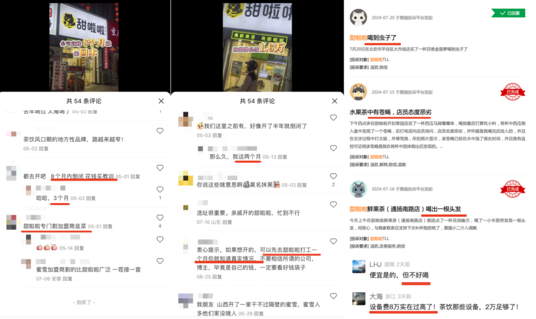 但過(guò)低的加盟門檻也帶來(lái)了另外的挑戰(zhàn),加盟商素質(zhì)參差不齊,管理難度大大提高。黑貓投訴上,不乏有關(guān)甜啦啦食安、服務(wù)欠缺的投訴。