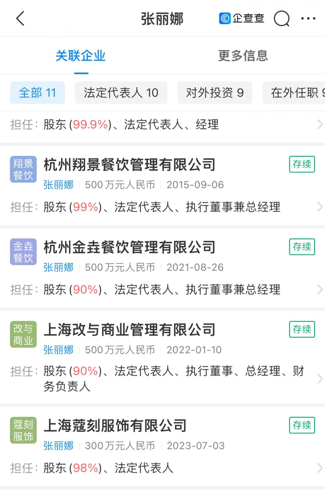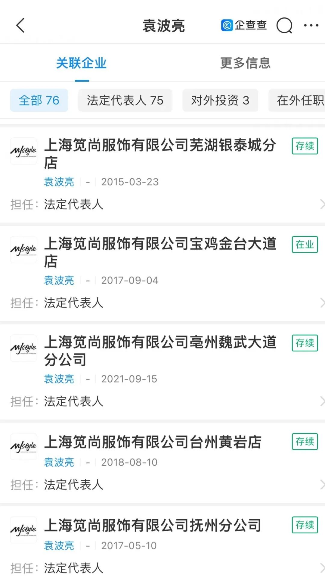 值得注意的是,張麗娜除了是上?芸谭椨邢薰痉ǘù砣送,還是上海改與商業(yè)管理有限公司法定代表人,今年4月,上海改與商業(yè)管理有限公司實(shí)際控制人從袁波亮變更為張麗娜,而袁波亮是MJStyle所屬公司上海筧尚服飾有限公司多家分公司法定代表人。