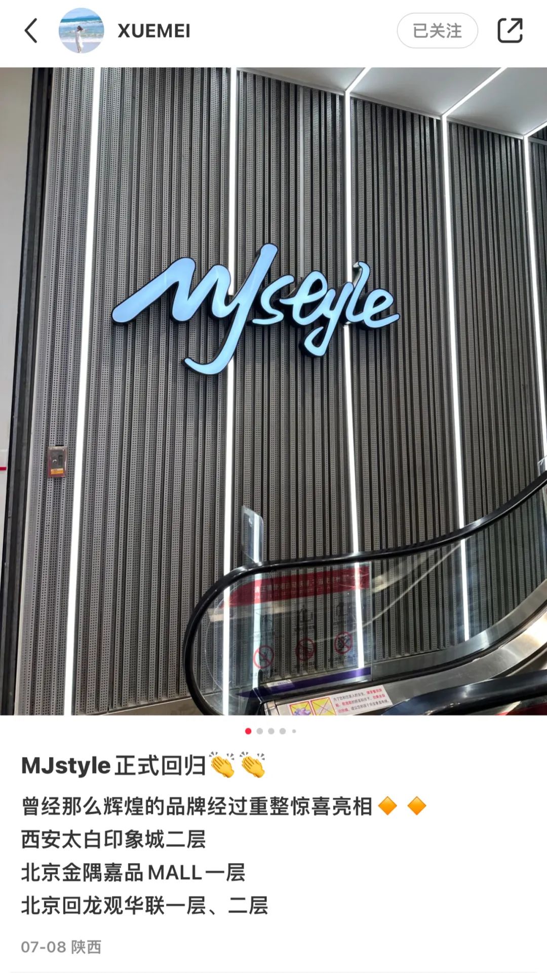 《聯(lián)商網(wǎng)》以MJstyle作為關(guān)鍵詞在小紅書(shū)上搜索,發(fā)現(xiàn)一個(gè)名為“XUEMEI”的賬號(hào)正在售賣MJstyle產(chǎn)品,并且在7月8日宣布MJstyle正式回歸,在其更新MJstyle門(mén)店的相關(guān)信息中,包括北京已經(jīng)開(kāi)業(yè)的兩家門(mén)店,其賬號(hào)認(rèn)證企業(yè)名稱為裕華區(qū)正信潮品百貨商行。