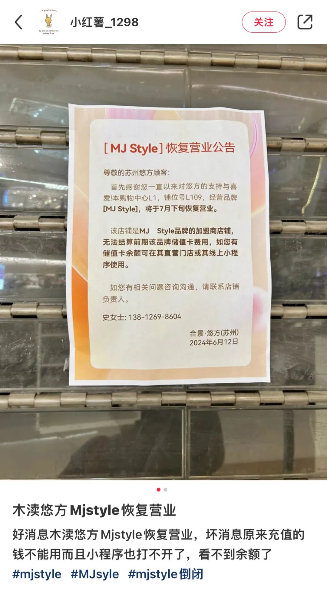 蘇州門(mén)店貼出的公告指出:店鋪是MJStyle的加盟商店鋪,無(wú)法結(jié)算前期該品牌儲(chǔ)值卡費(fèi)用,如果您有儲(chǔ)值卡余額可以在直營(yíng)門(mén)店或其線上小程序使用。