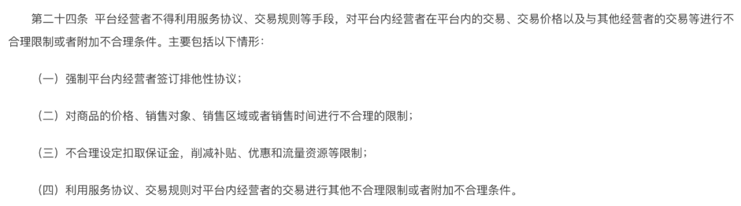 《規(guī)定》第二十四條提出:平臺(tái)經(jīng)營者不得利用服務(wù)協(xié)議、交易規(guī)則等手段,對(duì)平臺(tái)內(nèi)經(jīng)營者在平臺(tái)內(nèi)的交易、交易價(jià)格以及與其他經(jīng)營者的交易等進(jìn)行不合理限制或者附加不合理?xiàng)l件。