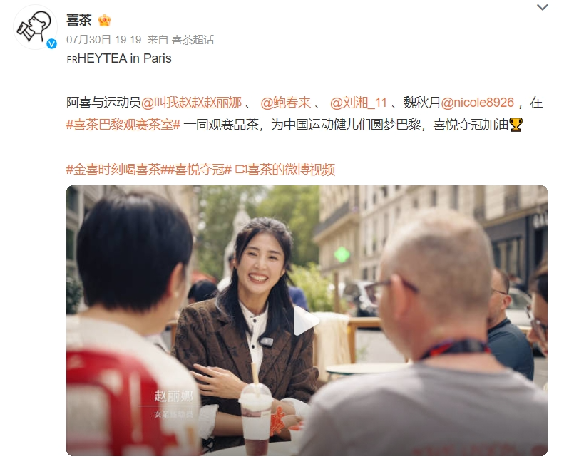 今年的巴黎奧運(yùn)會(huì),現(xiàn)制茶飲品牌意外“露臉”;霸王茶姬在巴黎圣拉扎爾火車站的TEA BAR線下快閃店免費(fèi)送飲品,喜茶在塞納河右岸的快閃門店“喜茶巴黎觀賽茶室”開(kāi)派對(duì)。即便是沒(méi)有獲得官方合作身份、沒(méi)有和任何運(yùn)動(dòng)員攜手共創(chuàng)的品牌,依然有方法將自己與賽事進(jìn)行強(qiáng)鏈接。