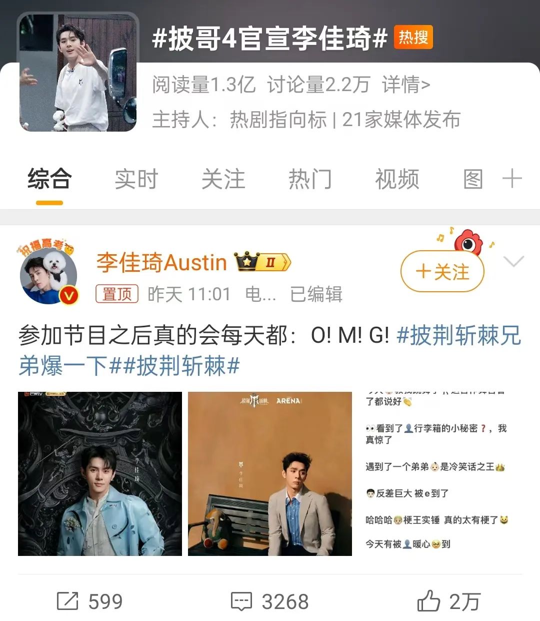 近日,李佳琦發(fā)文宣布自己參加了《披荊斬棘的哥哥4》。相關(guān)話題迅速?zèng)_上微博熱搜,引發(fā)眾人熱議。