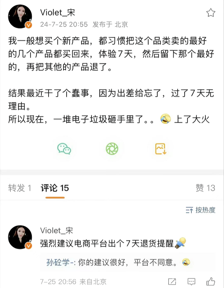 前 iQOO 手機產(chǎn)品經(jīng)理、現(xiàn)理想汽車高管宋紫薇在社交平臺上表示,“習慣把這個品類賣得最好的幾個產(chǎn)品都買回來,體驗7天,然后留下那個最好的,再把其他的產(chǎn)品退了”。甚至,她還在評論區(qū)強烈建議電商平臺出個7天退貨提醒。