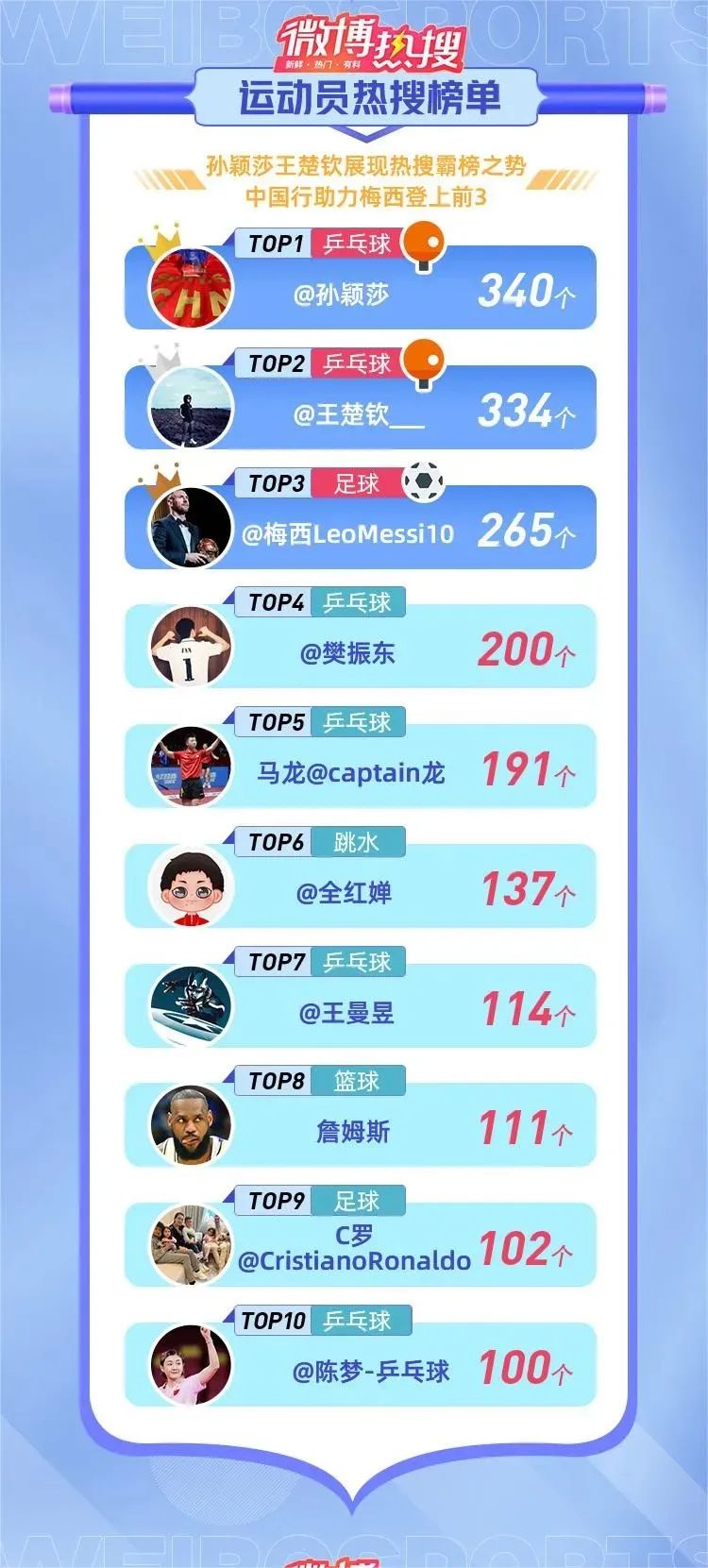 就后者來(lái)說(shuō),微博體育、微博熱點(diǎn)發(fā)布的《2023年運(yùn)動(dòng)員微博報(bào)告》顯示,乒乓球運(yùn)動(dòng)員處于頂流地位,去年以1119個(gè)熱搜斷層式領(lǐng)先,樊振東憑借200個(gè)熱搜位列第四,全紅嬋、王曼昱、勒布朗·詹姆斯、C羅、陳夢(mèng)等均位居其后。