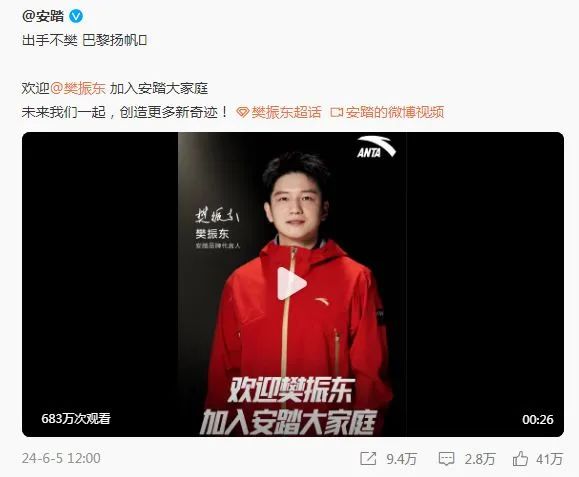 兩個(gè)月前的6月5日,安踏官宣樊振東為品牌代言人。從當(dāng)時(shí)“出手不樊,巴黎揚(yáng)帆,歡迎樊振東加入安踏大家庭”的推介語(yǔ)來(lái)看,簽下樊振東,安踏是沖著巴黎奧運(yùn)會(huì)來(lái)的。