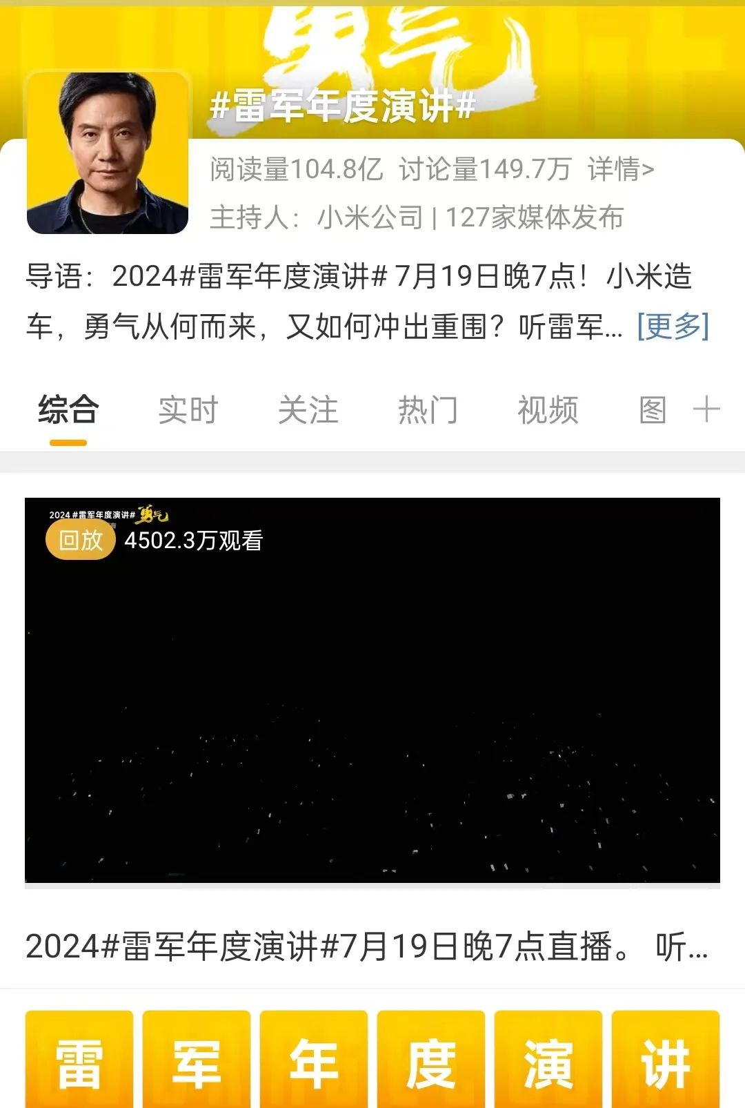 甚至在微博,“雷軍年度演講”話題閱讀量高達104.8億,討論量也達到140多萬,直播回放觀看量更是接近4500萬。