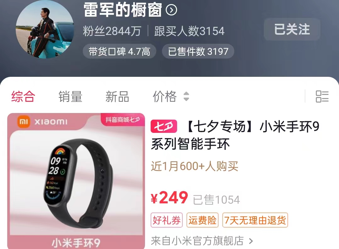 這不,雷軍真的聽勸了,開始在自己的個人賬號帶貨。近日,雷軍抖音賬號的商品櫥窗一欄,悄悄上線了其首個帶貨產品——小米手環(huán)9。頁面顯示,該商品參加了抖音商城七夕專場活動,定價249元,目前已經售出了1054件,銷量表現(xiàn)不算出色。