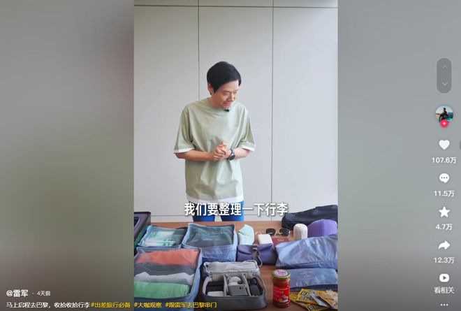 大約一周前,雷軍前往巴黎出差。在準備啟程時,他拍了個視頻,跟網友展示一下整理行李的過程,包括護照、充電寶、耳機、墨鏡等,都要跟鏡頭展示一下。