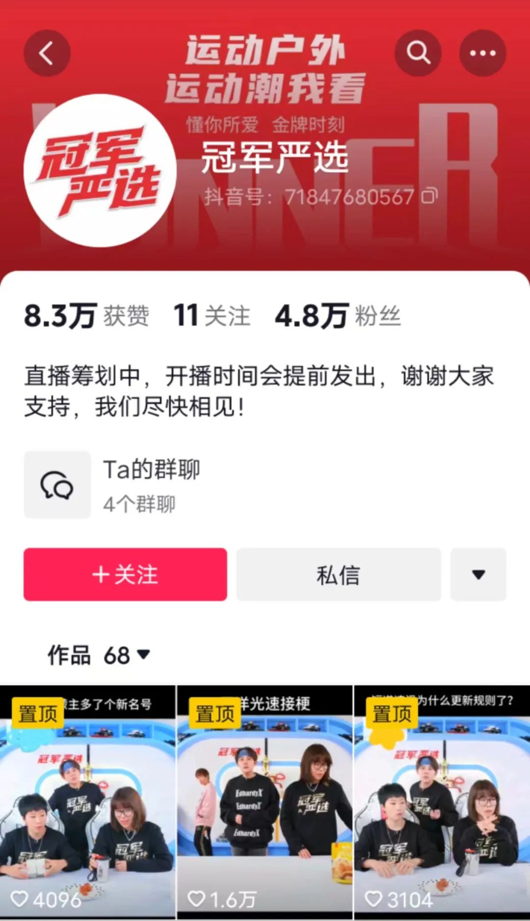 雙11結(jié)束后,冠軍嚴(yán)選的抖音賬號(hào)也停止了運(yùn)營,賬號(hào)的簡介顯示“直播籌劃中……我們盡快相見”。