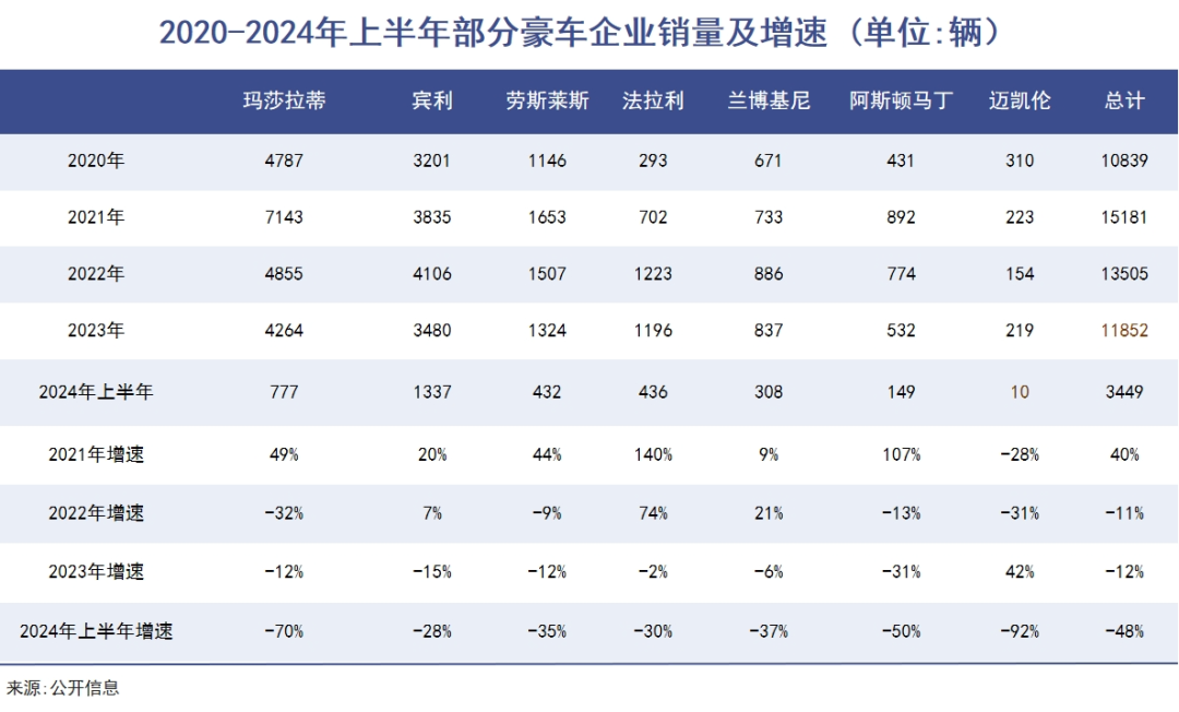 此外,從進(jìn)口數(shù)據(jù)來看,超豪華汽車上半年同比下滑48%。其中,賓利下滑28%,瑪莎拉蒂70%、法拉利30%、阿斯頓50%、邁凱倫92%。
