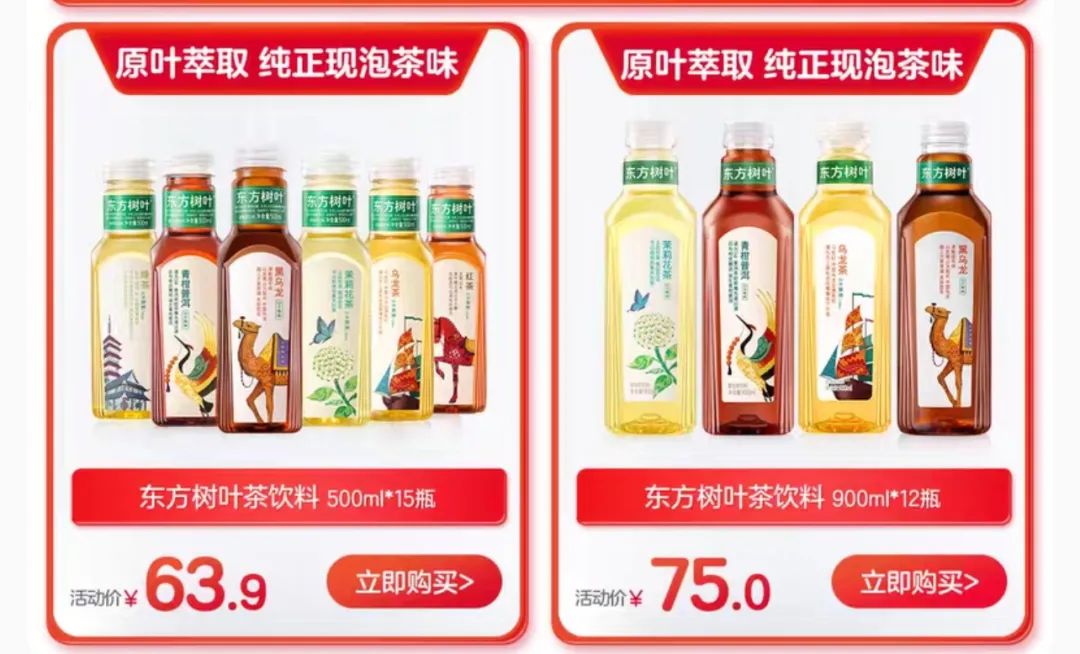 不論是超值裝還是屌絲裝,內(nèi)核都指向了性價比。以東方樹葉為例,農(nóng)夫山泉官方天貓旗艦店,900ml東方樹葉,12瓶一箱,活動價75元,平均6.25元/瓶。15瓶一箱的500ml東方樹葉,活動價63.9元,平均7.62元/瓶,大瓶裝相對于標準裝來說,每百毫升價格低了18.5%。