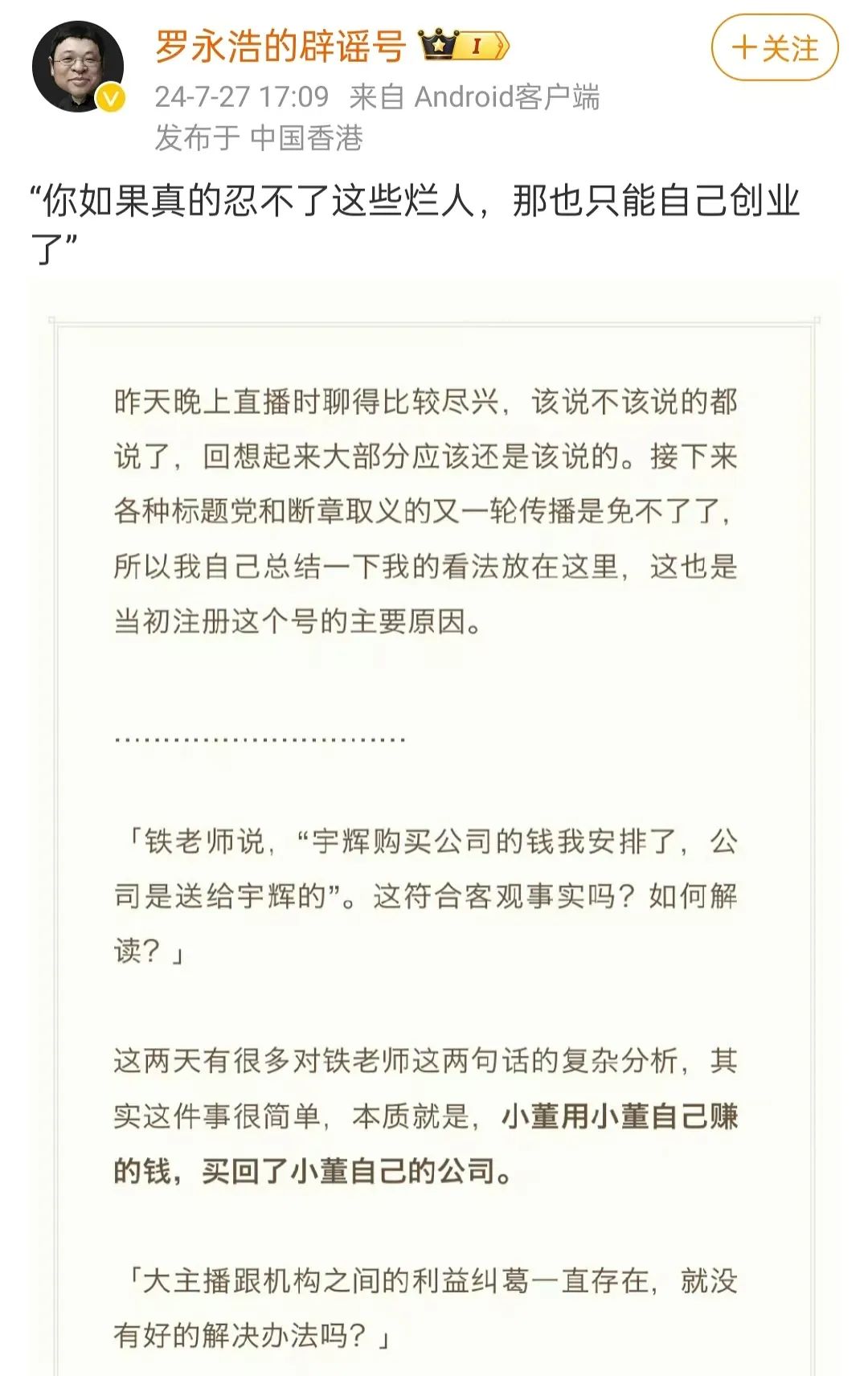 7月25日,東方甄選發(fā)布公告,宣布董宇輝正式離職。而羅永浩的點(diǎn)評(píng)也飛速而至。