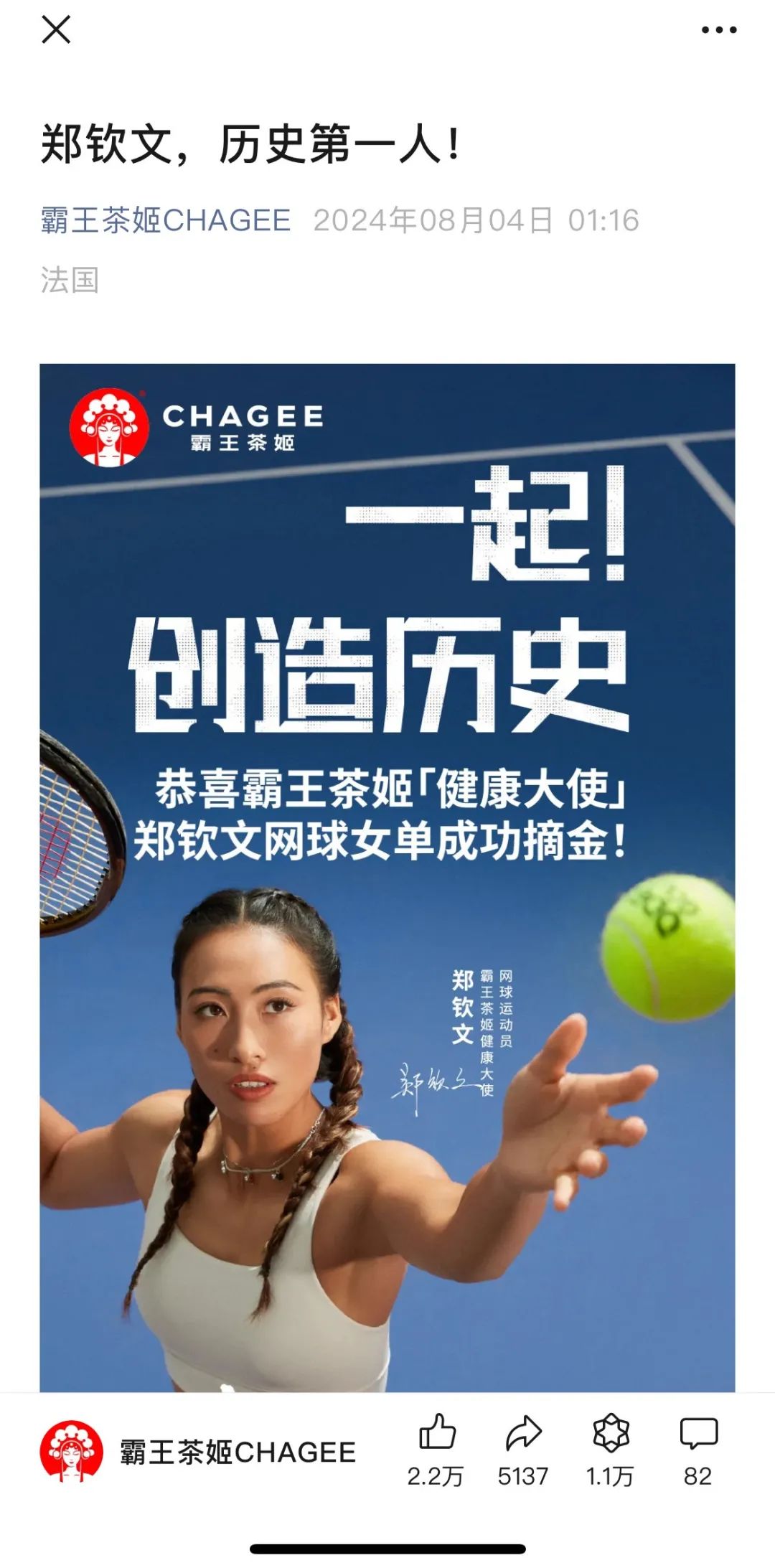 21歲的鄭欽文,一語中的,在巴黎奧運(yùn)會網(wǎng)球女子單打金牌賽中,中國選手鄭欽文大比分2:0戰(zhàn)勝克羅地亞選手維基奇,奪得金牌,霸王茶姬隨后在其微信公眾號上發(fā)文表示祝賀其健康大使奪冠成功。