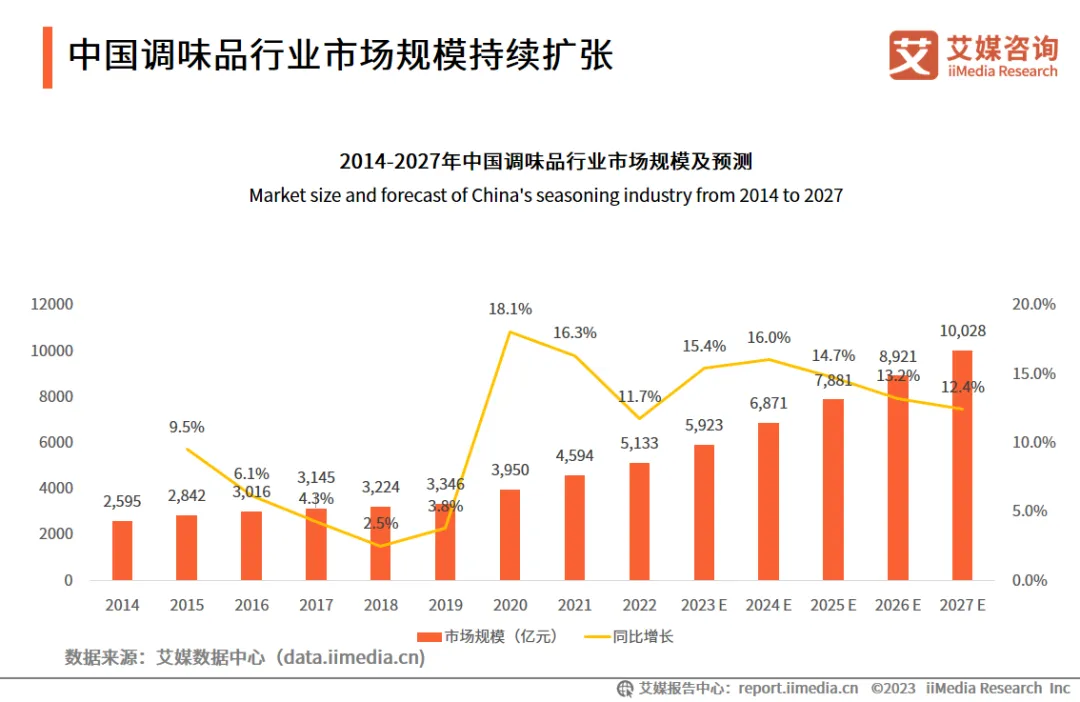 據(jù)艾媒咨詢數(shù)據(jù),2022年我國(guó)調(diào)味品行業(yè)市場(chǎng)規(guī)模達(dá)5133億,預(yù)計(jì)在2027年將會(huì)正式突破萬(wàn)億大關(guān)。市場(chǎng)規(guī)模持續(xù)增長(zhǎng)的過(guò)程中,“有機(jī)、減鈉、零添加”等健康調(diào)味品成為熱門賽道。