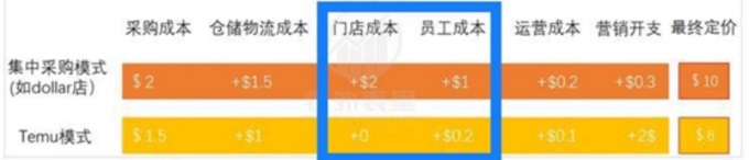 圖:Temu與美國Dollar店定價(jià)各環(huán)節(jié)成本對(duì)比(以某日用百貨商品為例)