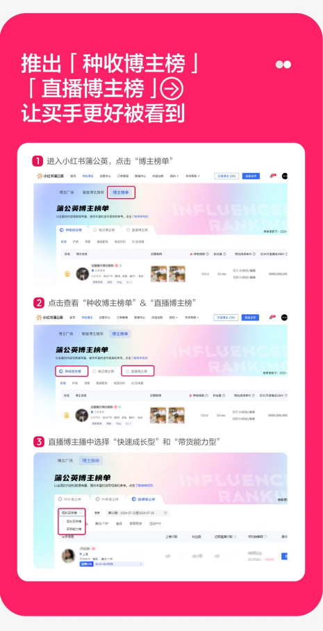 此外,系統(tǒng)還新增了“種收博主榜”與“直播博主榜”,這些榜單根據(jù)博主的表現(xiàn)進(jìn)行排名,使得商家能夠更快地鎖定優(yōu)秀的合作對象。