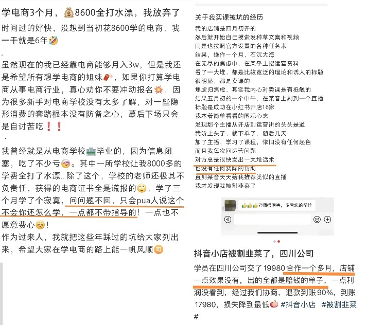 事實(shí)上,社交媒體上也并不乏消費(fèi)者對(duì)于被電商培訓(xùn)課程“割韭菜”的吐槽。