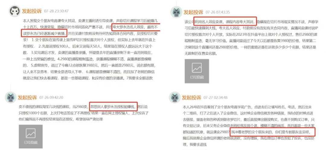 在黑貓投訴平臺(tái)上,就有不少學(xué)員指責(zé)電商學(xué)苑利用名人光環(huán)吸引顧客,但課程內(nèi)容卻粗制濫造,用重復(fù)的切片充數(shù)。
