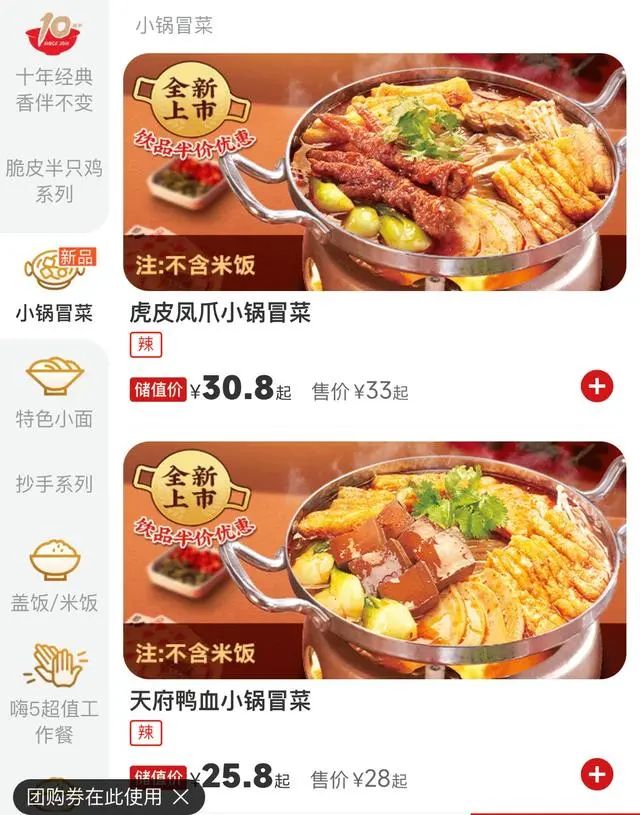 今年3月,遇見小面推出了新品“小鍋冒菜”,分虎皮雞爪、天府鴨血等4種口味,定價30元左右。