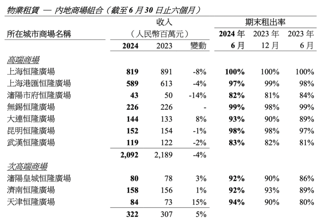 恒隆地產(chǎn)在財(cái)報(bào)中指出:一線城市奢侈品消費(fèi)低迷是造成恒隆地產(chǎn)內(nèi)地收入下跌的主因,恒隆地產(chǎn)在內(nèi)地的高端商場(chǎng)整體收入下跌4%,其中上海恒隆廣場(chǎng)上半年的收入同比下跌8%,上海港匯恒隆廣場(chǎng)實(shí)現(xiàn)收入同比下跌4%,上文商戰(zhàn)主角之一的武漢恒隆廣場(chǎng)上半年收入同比下跌2%,根據(jù)公告,恒隆地產(chǎn)內(nèi)地7家高端商場(chǎng)中,僅大連恒隆廣場(chǎng)收入同比增長(zhǎng)8%。