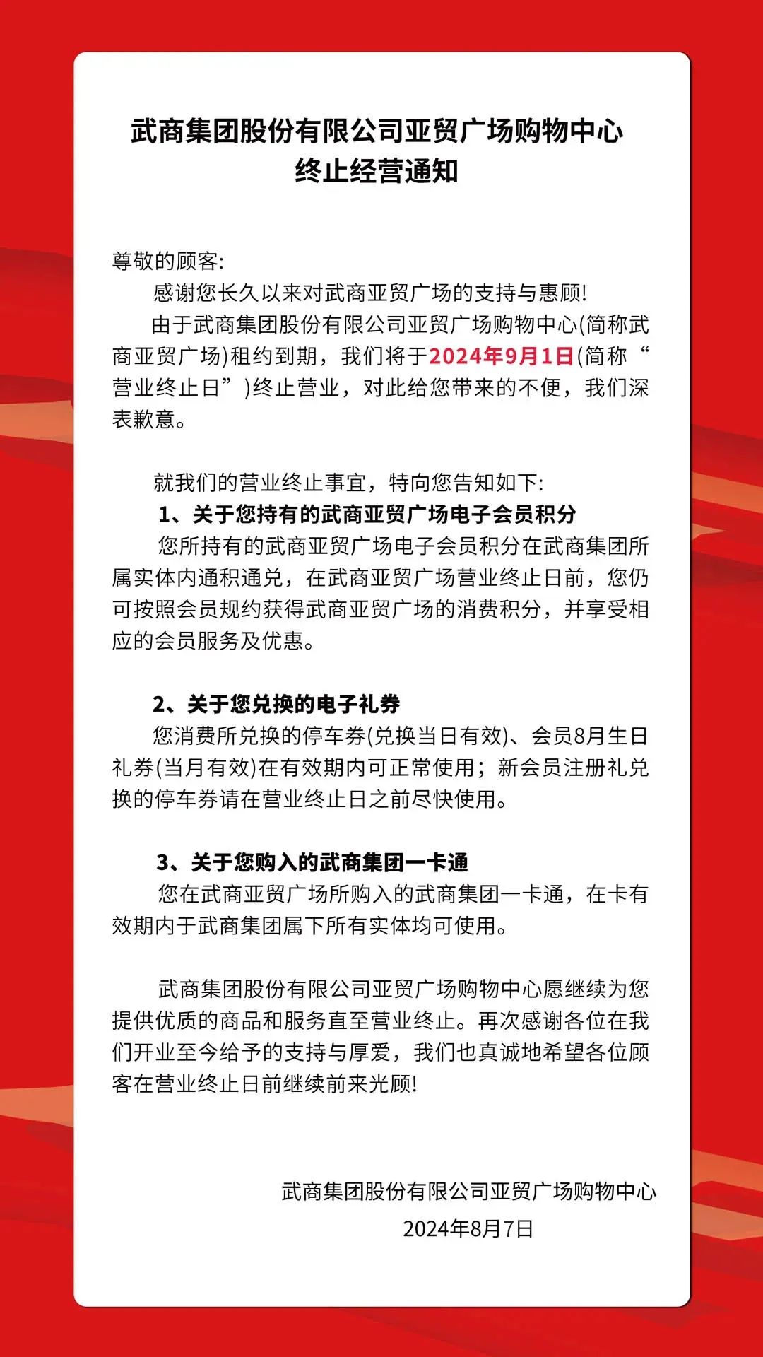 根據(jù)通知,因?yàn)樽饧s到期,武商亞貿(mào)廣場(chǎng)將于9月1日終止?fàn)I業(yè)。