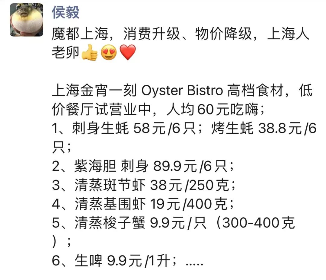 8月7日,侯毅在朋友圈發(fā)布了他最新推動(dòng)的項(xiàng)目——一家名為“金宵一刻”的平價(jià)海鮮餐館,位于上海瞿溪路,定位“銀發(fā)居酒屋”,人均消費(fèi)大約60元。