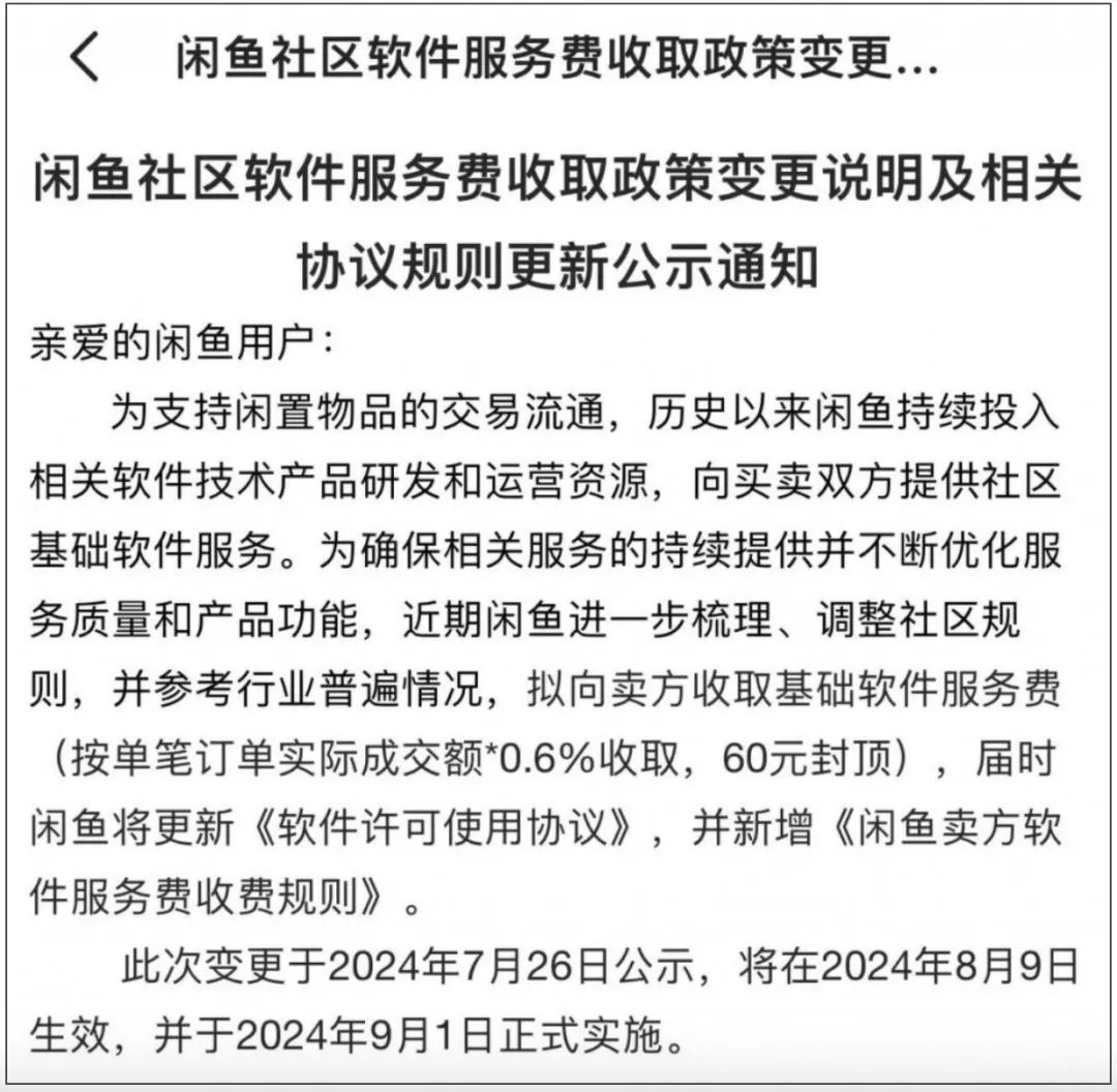 阿里旗下的二手電商平臺閑魚也宣布從9月1日開始向賣家收取0.6%的基礎(chǔ)軟件服務費,單筆最高收取60元。