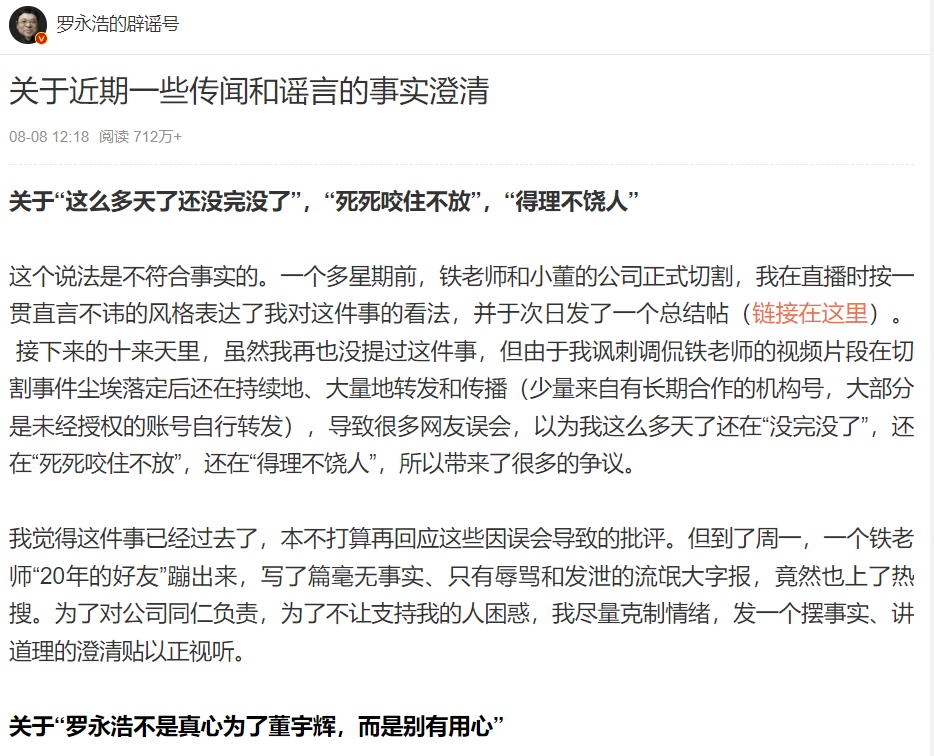 羅永浩自然不服,次日也發(fā)微博硬剛,表示“被潑了一個(gè)多禮拜的臟水,不會(huì)再忍下去了”,再然后便是洋洋灑灑的5000字長(zhǎng)文回?fù)簟?/p>