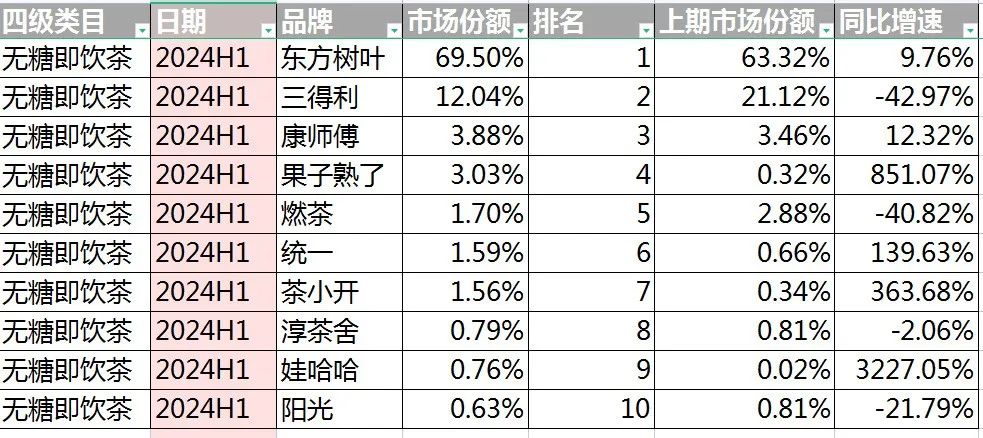 2024年上半年無糖茶市場份額增速