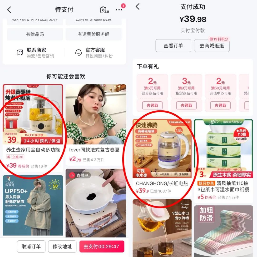 7月中旬,用戶在抖音電商提交了訂單但未付款情況下,平臺(tái)會(huì)自動(dòng)推送“你可能還會(huì)喜歡”的商品頁(yè)面。當(dāng)時(shí),這一頁(yè)面位于用戶屏幕的中下方,且推薦商品大多為用戶所購(gòu)買(mǎi)商品的低價(jià)替代款。付款后,用戶在支付成功頁(yè)面,仍能看到相似商品推薦。