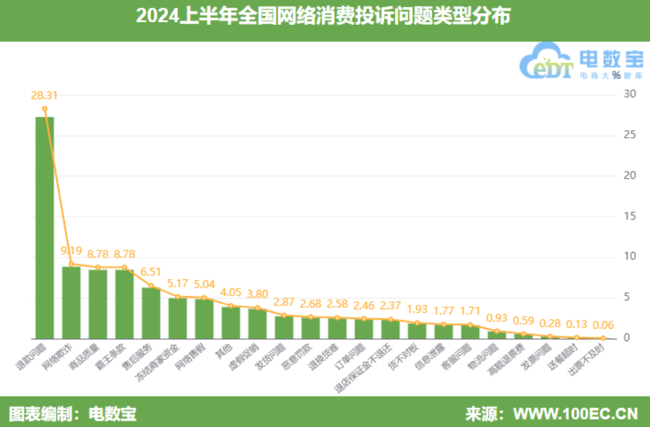 哪怕到現(xiàn)在,退款問題仍然是個重災(zāi)區(qū)。據(jù)電數(shù)寶統(tǒng)計,2024上半年全國網(wǎng)絡(luò)消費投訴問題類型TOP10中,退款問題的占比依舊高達28.31%。