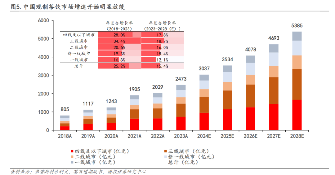 據(jù)機(jī)構(gòu)數(shù)據(jù),最近幾年,三線、四線及以下城市,現(xiàn)制茶飲迎來了快速增長,市場規(guī)模由2018年的163億元、214億元,增至2023年的716億元和735億元,CACR分別達(dá)到34.3%和28.0%,預(yù)計(jì)未來5年,增速會高于一二線城市。