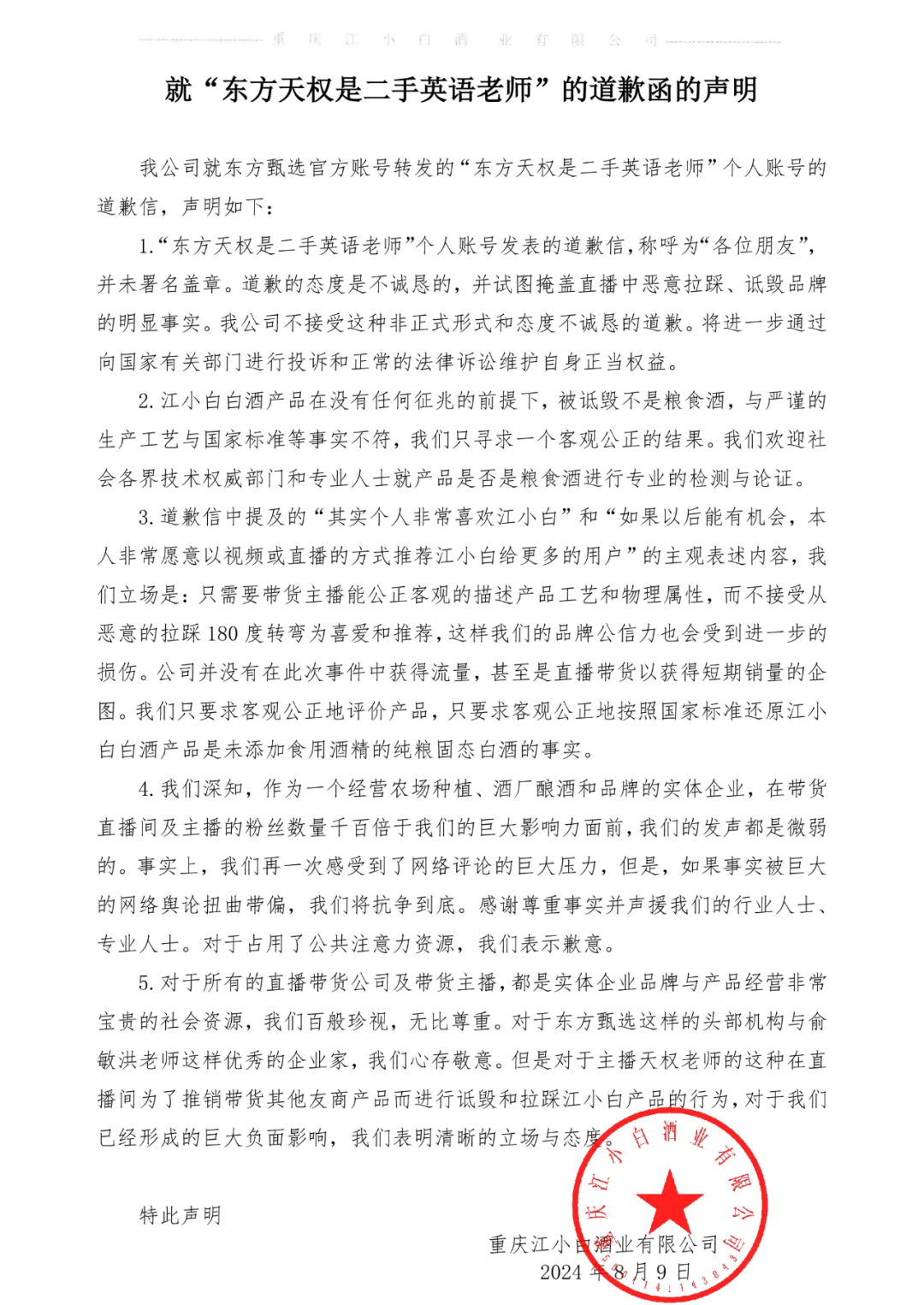 8月9日下午,江小白發(fā)布聲明稱,其言論嚴重背離事實,給品牌形象和市場信譽造成巨大傷害,“品質(zhì)問題是我們的底線,我們再難沉默”。