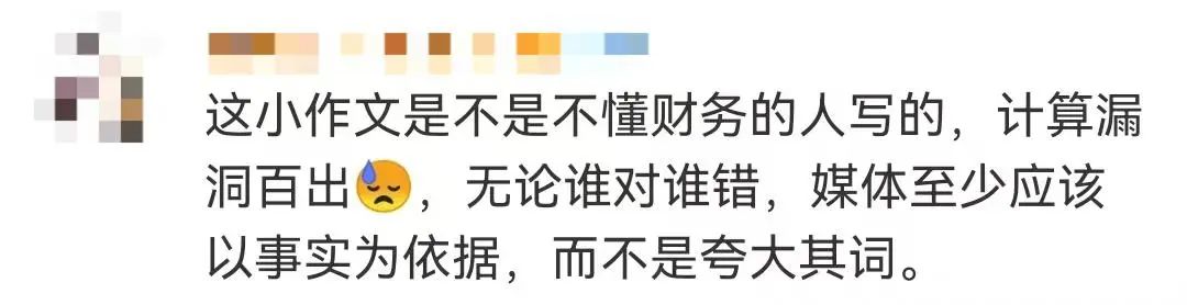 因此,消息曝光后,引發(fā)了不少網(wǎng)友的質(zhì)疑。有網(wǎng)友評論,“這小作文是不是不懂財務(wù)的人寫的,計算漏洞百出,無論誰對誰錯,媒體至少應(yīng)該以事實為依據(jù),而不是夸大其詞!