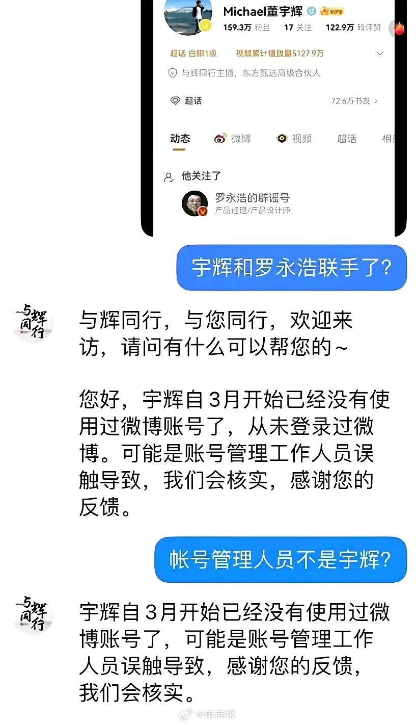 對此,與輝同行官方客服回應(yīng)表示,“宇輝自3月開始已經(jīng)沒有使用過微博賬號了,從未登錄過微博?赡苁琴~號管理工作人員誤觸導(dǎo)致,我們會核實,感謝您的反饋!