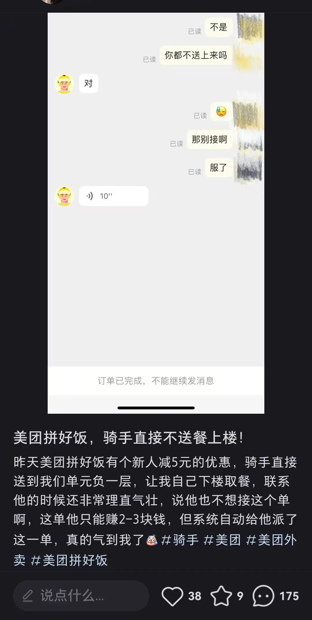 這種矛盾,讓不少騎手心生怨氣。騎手拿平臺(tái)沒有辦法,就只能將怨氣撒在消費(fèi)者身上。社交平臺(tái)上,就有不少拼好飯用戶吐槽騎手的。