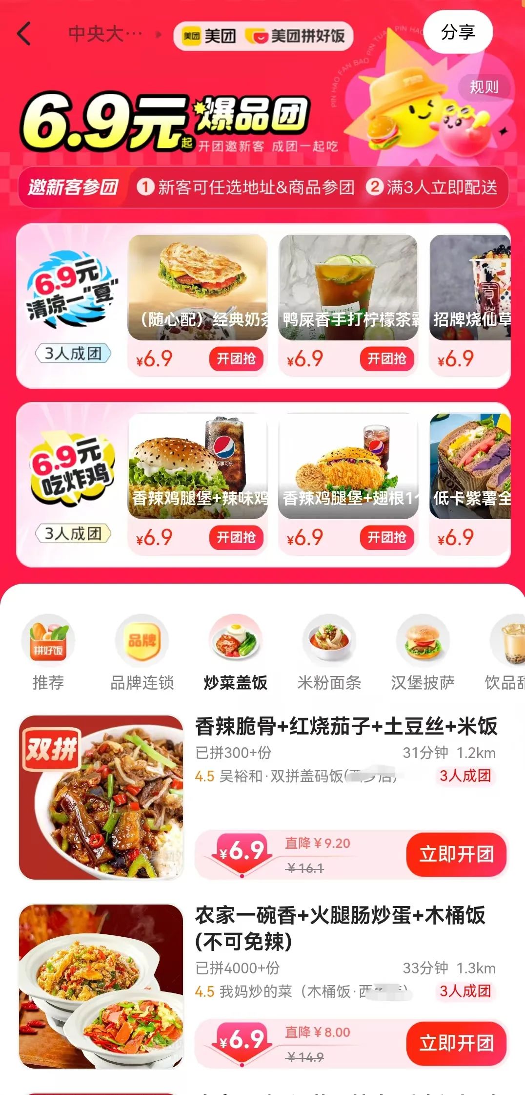 在美團(tuán)拼好飯的頁面中,有一個(gè)6.9元爆品團(tuán)的入口。點(diǎn)進(jìn)去之后發(fā)現(xiàn),頁面顯示的所有商品都是6.9元。