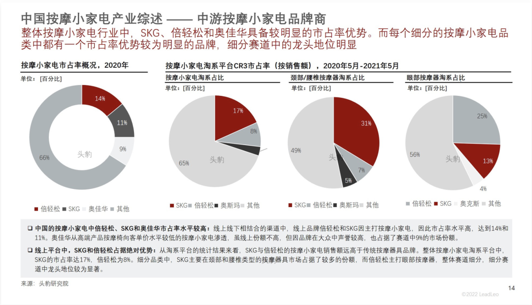 2022年,頭豹研究院發(fā)布的《中國(guó)按摩小家電行業(yè)》報(bào)告顯示,線上線下相結(jié)合的渠道中,倍輕松和SKG的市占率分別達(dá)到14%和11%。這兩大頭部品牌的增長(zhǎng),主要來(lái)源于線上渠道的快速發(fā)展。