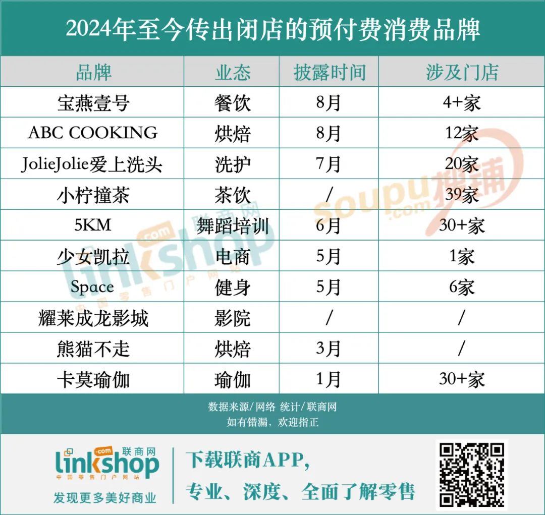 據(jù)聯(lián)商網(wǎng)不完全統(tǒng)計(jì),今年以來,已有涉及影院、舞蹈、烘焙、健身、瑜伽、茶飲等9個(gè)業(yè)態(tài)的10家消費(fèi)品牌傳出“倒閉”“跑路”等消息,消費(fèi)者也因此陷入了預(yù)付費(fèi)「圍城」。