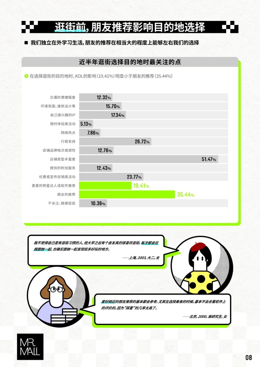 哪怕對于沒有成名的每一個“我”和“你”,這一論斷同樣成立。我們調(diào)研了1000名00后得出的《Mall先生:00后線下消費態(tài)度測評報告》里發(fā)現(xiàn),有超過35%的00后會根據(jù)“朋友的推薦”選擇逛街目的地,超過了“喜愛的明星達人或軟件推薦”的19%。如今的“小滲透”,比“大聲量”更有效。