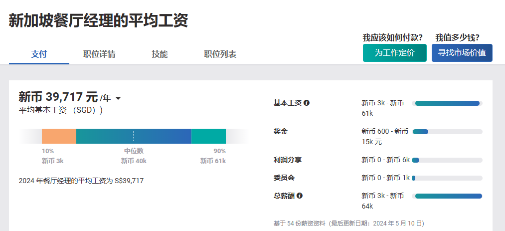 相較于餐飲小販無需承擔(dān)人力成本,餐飲門店經(jīng)營(yíng)成本可能更高。按照2023年新加坡相關(guān)政策要求,食品服務(wù)業(yè)工人以2023年1750新元最低工資為基礎(chǔ),按照每年165新元的速度逐步增長(zhǎng),2025年最低工資需達(dá)到2080新元。另?yè)?jù)Payscale平臺(tái)顯示,新加坡餐廳經(jīng)理平均年薪為39717新元。