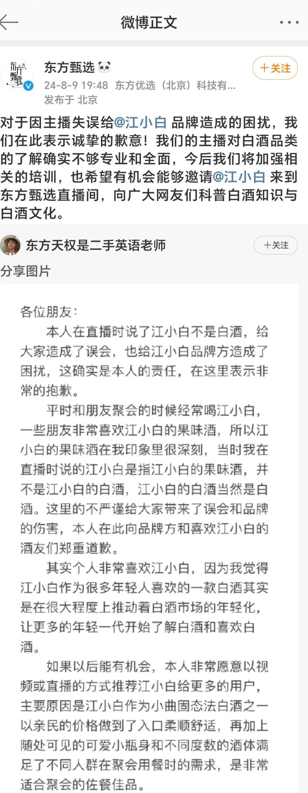 很快,東方甄選發(fā)布道歉聲明稱,“今后我們將加強(qiáng)相關(guān)的培訓(xùn),也希望有機(jī)會(huì)能夠邀請(qǐng)江小白來(lái)到東方甄選直播間,向廣大網(wǎng)友們科普白酒知識(shí)與白酒文化!