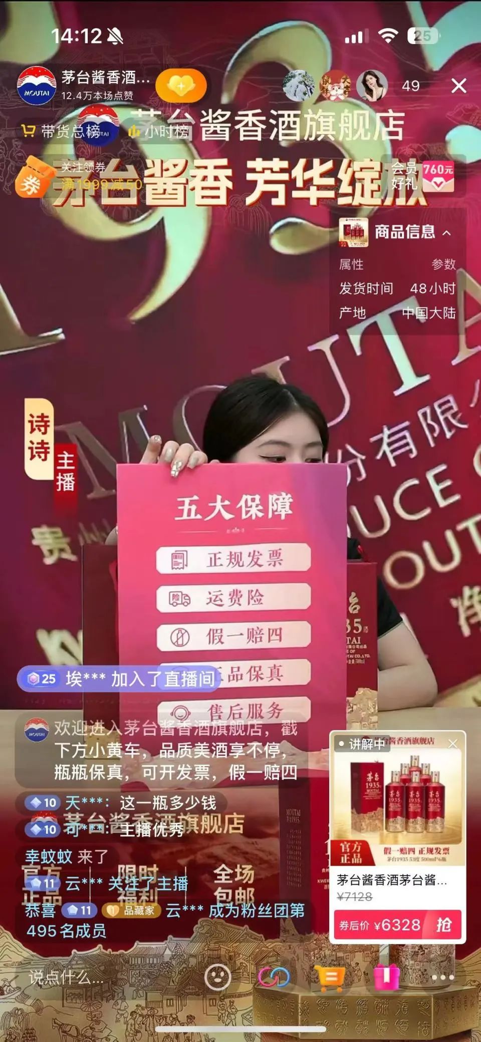 有粉絲在評(píng)論區(qū)留言“沒有優(yōu)惠”,主播便強(qiáng)調(diào)購買高端酒水渠道的重要性,并稱可以提供開發(fā)票服務(wù),“茅臺(tái)醬香酒旗艦店有抖音藍(lán)V認(rèn)證,不用擔(dān)心酒體品質(zhì)問題。瓶瓶保真,滴滴保質(zhì),假一賠四。”
