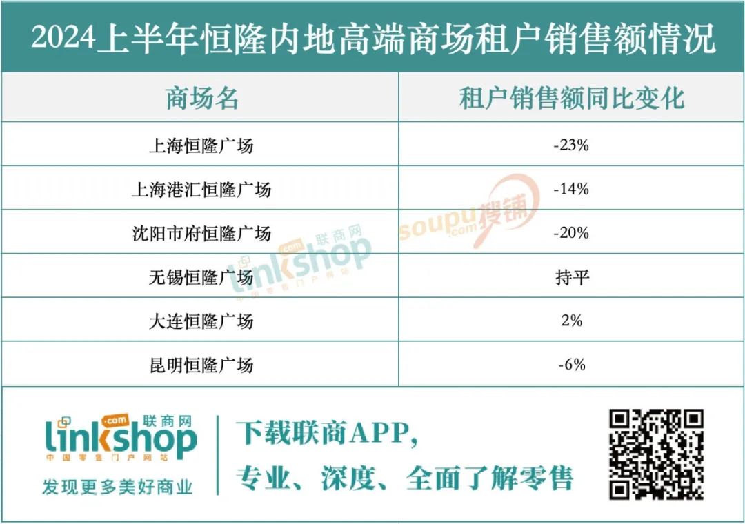 其中,內(nèi)地整體租賃收入下滑4%、租戶(hù)銷(xiāo)售額下滑13%。內(nèi)地零售物業(yè)方面,2024上半年恒隆的商場(chǎng)組合收入下跌3%。