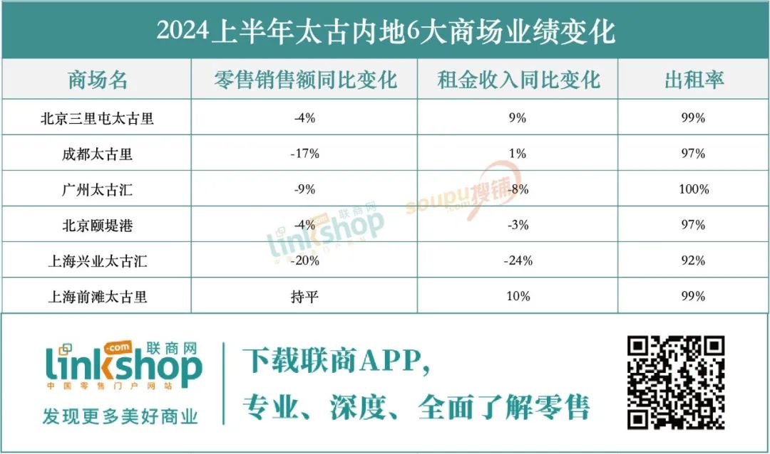 內(nèi)地零售物業(yè)上,太古上半年內(nèi)地商場(chǎng)整體零售銷(xiāo)售額同比上升了4%,但具體到項(xiàng)目上看,依然呈現(xiàn)了高端商場(chǎng)主跌,綜合類(lèi)商場(chǎng)相對(duì)穩(wěn)定的格局。