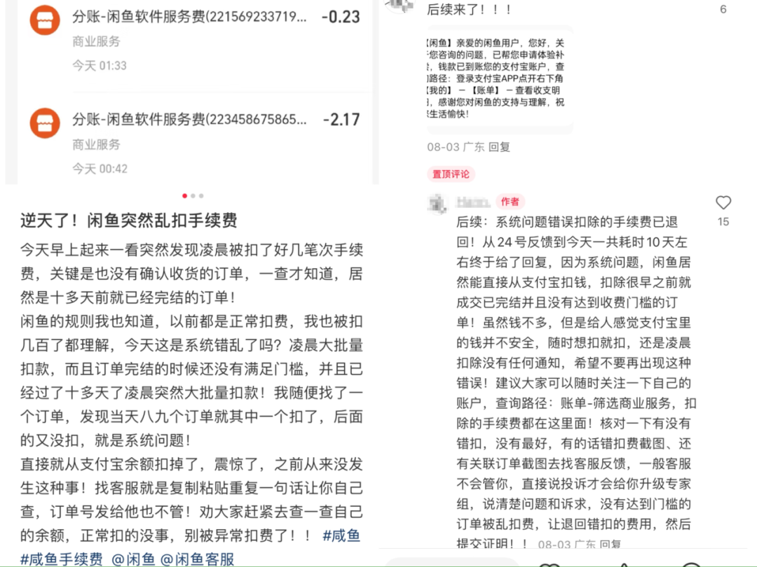 值得一提的是,有賣家提到自己在近期突然被閑魚亂扣手續(xù)費的情況,“閑魚的規(guī)則我也知道,以前都是正?圪M,今天是系統(tǒng)錯亂了嗎?”并表示“是凌晨大批量扣款,都是很早之前就成交已完結(jié)并且沒有達(dá)到收費門檻的訂單!倍@件事的后續(xù)是,閑魚給出回復(fù)并退回誤扣的手續(xù)費。